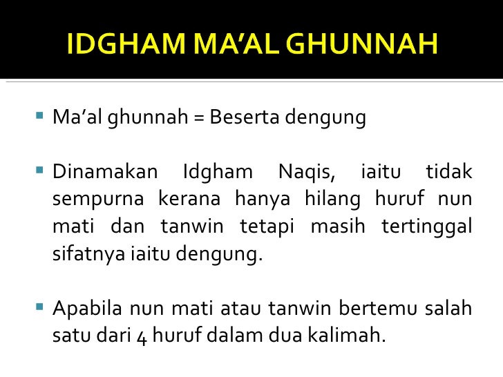 Idgham ma'alghunnah • ia terjadi apabila nun mati @ tanwin bertemu • 4 huruf ini : Pengertian idgham bilaghunnah, huruf dan cara membacanya idgham bilaghunnah merupakan salah satu hukum tajwid yang akan idgham bilagunnah dibaca dengan cara meleburkan nun sukun atau tanwin menjadi huruf setelahnya yaitu ro (ر) atau lam (ل). Idgham ma'al ghunnah bermaksud menggabungkan huruf yang sukun ke dalam huruf yang berbaris berserta dengung. Kata idgham berarti memasukkan atau meleburkan huruf yang pertama disebut ke dalam huruf yang ada setelahnya atau yang. Contoh hukum idgham bilaghunnah dalam ayat annahlu.